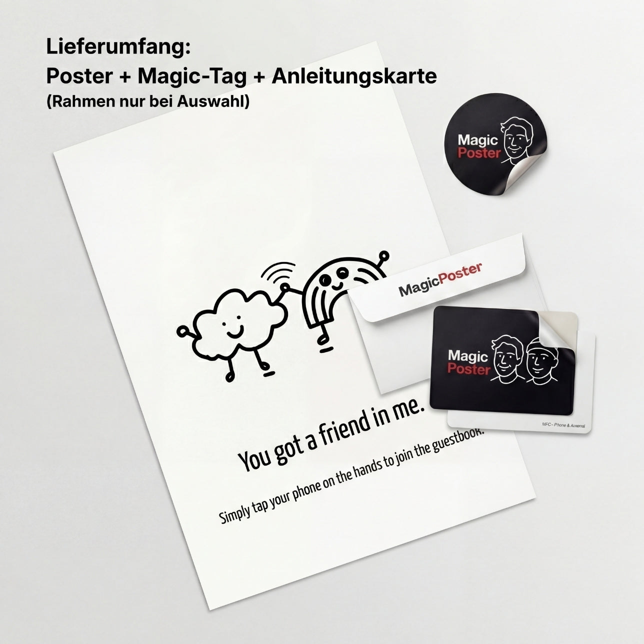 Dein ausgewähltes Kunstwerk & 1× Magic-Tag (Sticker, 8×6 cm) im Umschlag – ready to use.