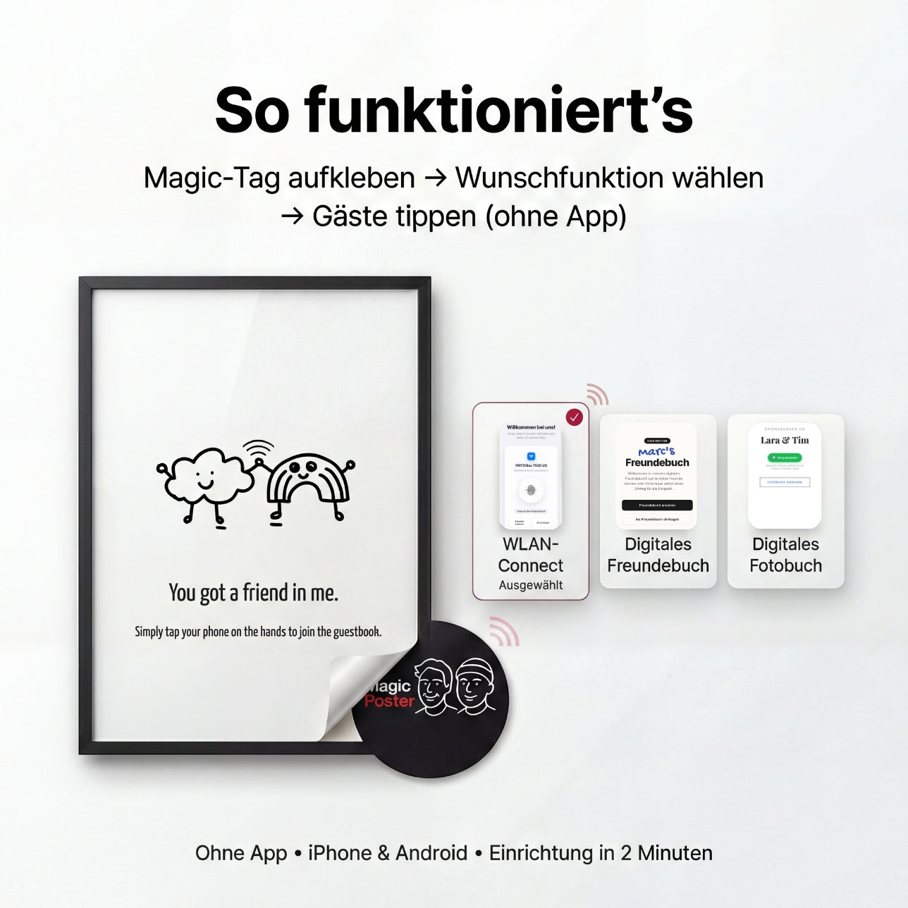 Dauert meist 1–2 Minuten: Tag aufkleben → Handy dranhalten → gewünschte Funktion auswählen (Freundebuch, Fotobuch, WLAN). Daten / Einträge können nach Auswahl der Magic-Funktion eingepflegt werden.